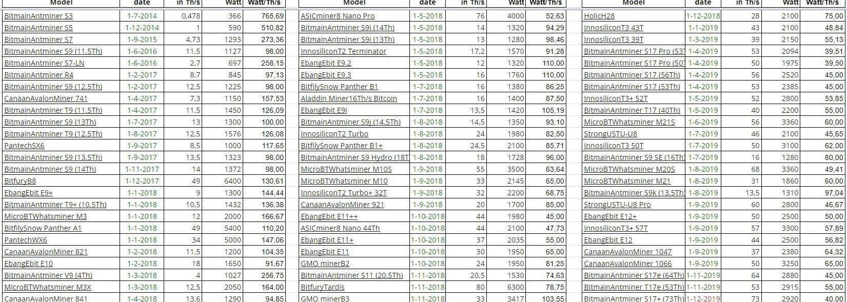 為了對比各挖礦設備的效率,以下表格已列出了過去及現在在市場上出售的所有挖礦設備。這些都是AsicSHA256礦機。雖然最后兩款尚未上市,但我還是將其包含在內。下圖效率以達到1Terahash/s的算力需多少瓦特的功率來表示。