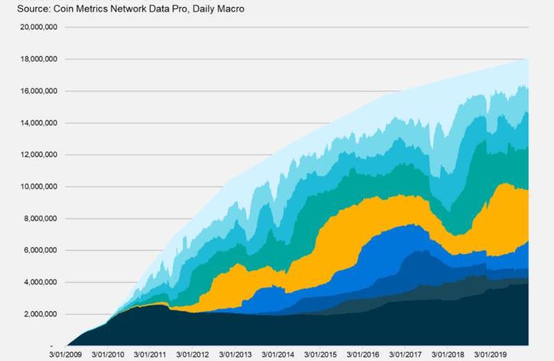 下圖顯示的是X年內未移動的比特幣數量,X的變化范圍為?1?個月到?5?年。