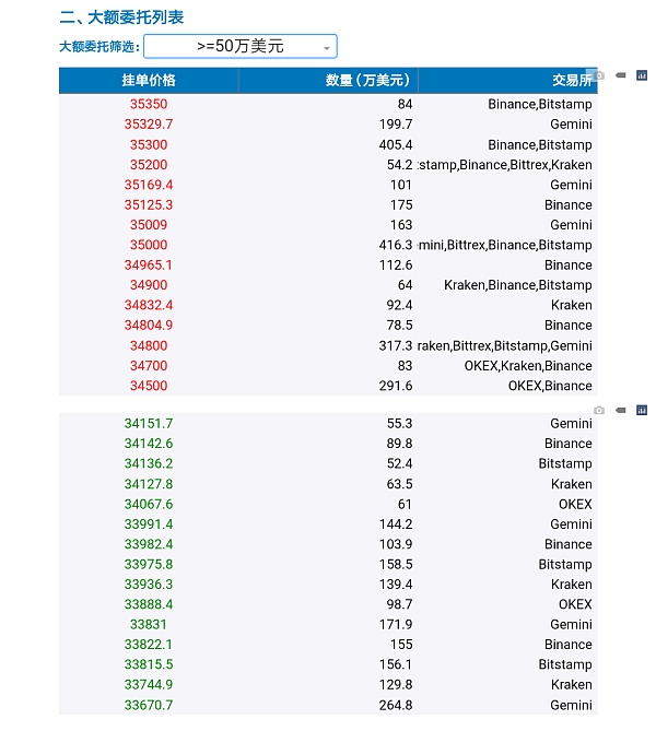 上圖展示了比特幣現貨市場高于50萬美元的掛單情況,不同價位的掛單量是由各個交易所的數據聚合而來的。例如,34700賣價上有價值83萬美元的比特幣出售,這是由OKEx、Kraken和Binance這3家交易所的掛單所組成的。