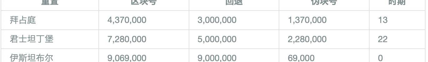 上圖用紅色來表示真實的區塊號,其取值范圍是0到8,920,000。而偽塊號起初與紅色的真實區塊號重合,直到發生了拜占庭分叉,偽塊號被重置到過去的3,000,000個區塊。然后,偽塊號與真塊號平行增長,直到君士坦丁堡分叉,偽塊號再次被重置。
