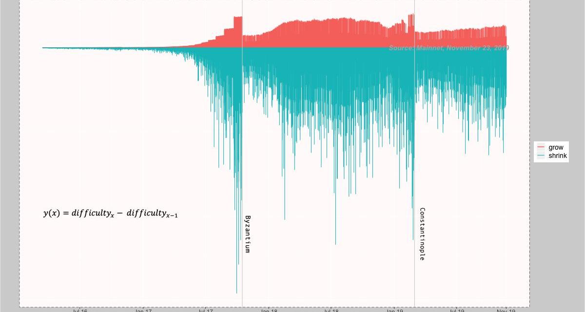 在下一張圖表中,我們來看看每個連續的區塊之間的難度變化。其計算公式為y(x)=區塊x的難度值—區塊x-1的難度值。