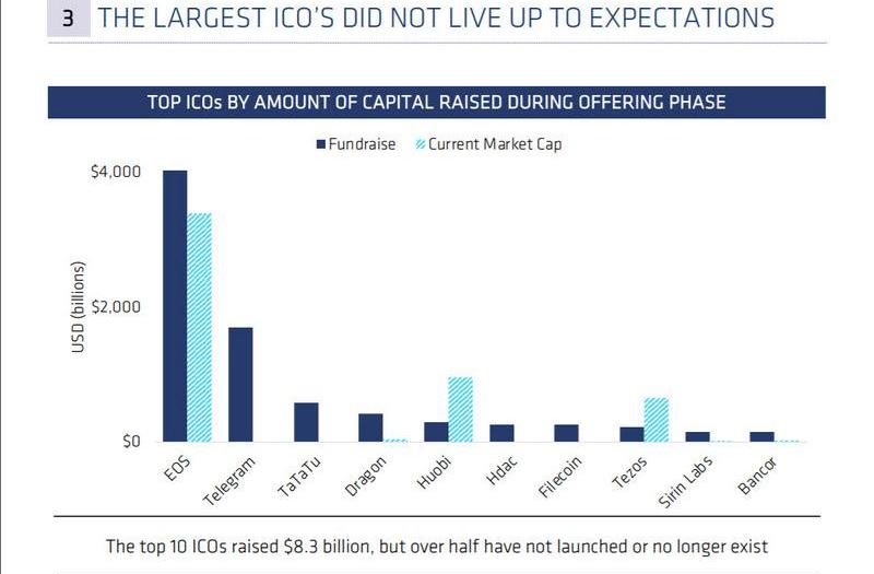 排名前十的ICO募資總額超過80億美元,然而其表現卻未達預期。超過一半的項目未能上所或者已經完全退出市場。