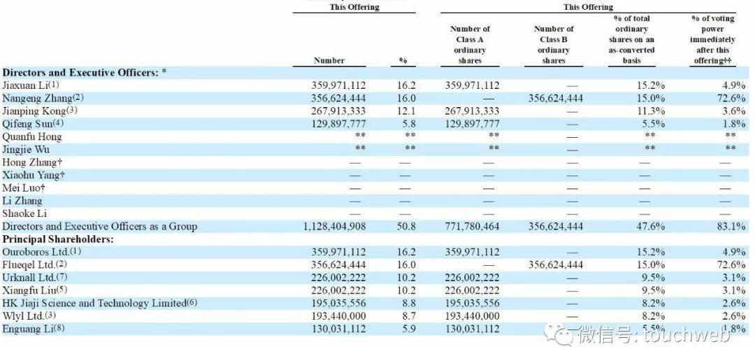IPO后,JiaxuanLi持股15.2%,有4.9%投票權;張楠賡持股15%,有72.6%的投票權;JianpingKong持股11.3%,有3.6%投票權;QifengSun持股5.5%,有1.8%的投票權。