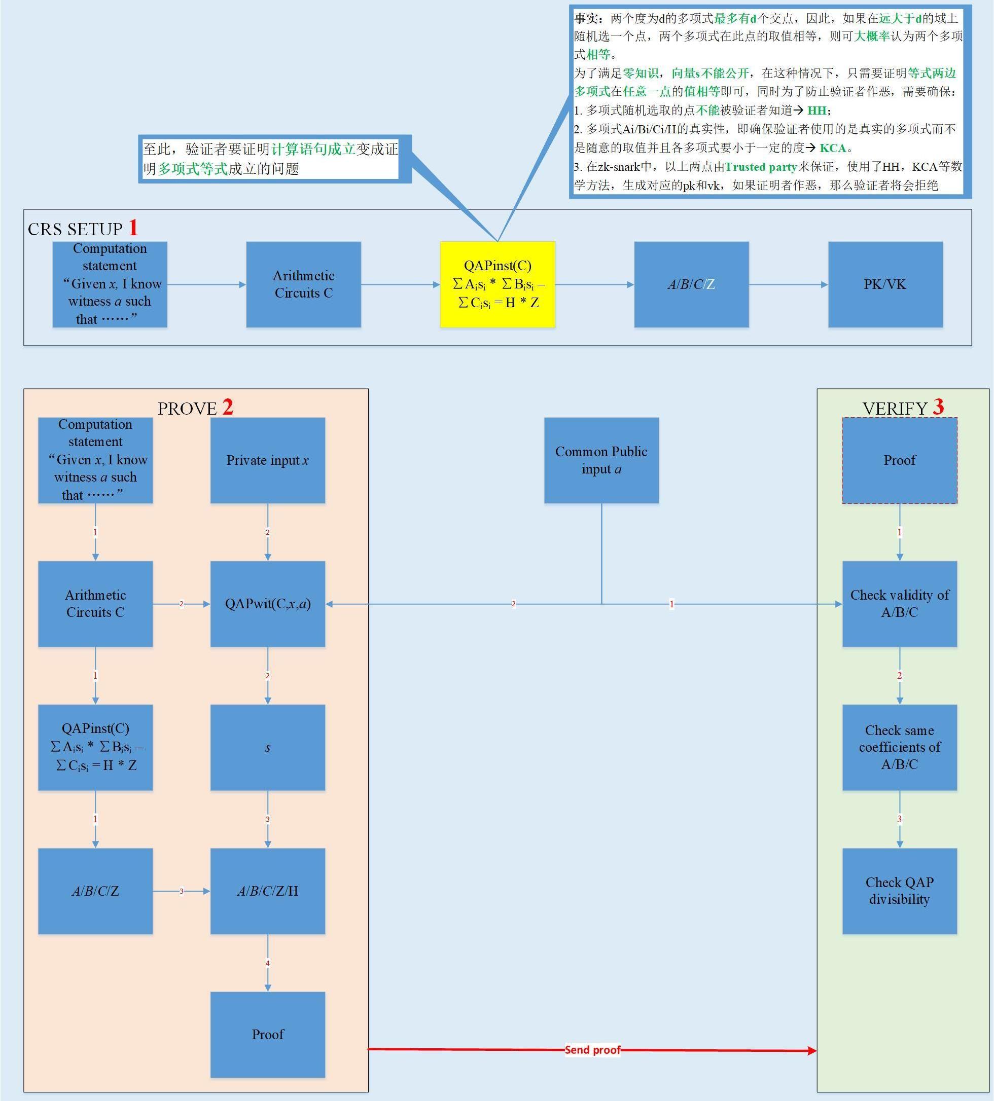 算法思想:將證明CIstatement成立問題轉換成證明多項式等式成立問題,轉換過程用到了算術環路和QAP方法;