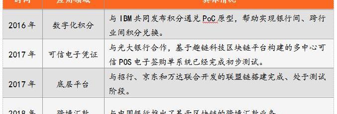 目前,中國銀聯在區塊鏈的應用實踐上涵蓋可信電子憑證應用、數字化積分應用、底層平臺搭建和跨境匯款等四方面。