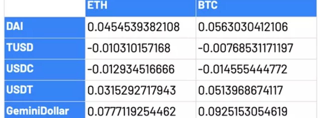 其中,USDC和TUSD的價值最小,與ETH和BTC呈負相關,說明在市場不穩定時,它們作為“存儲”代幣以規避風險:當ETH/BTC市場上漲時,用戶有可能賣出TUSD/USDC來進入市場;當市場下跌時,用戶可以將其持有的TUSD/USDC換成資產保值。