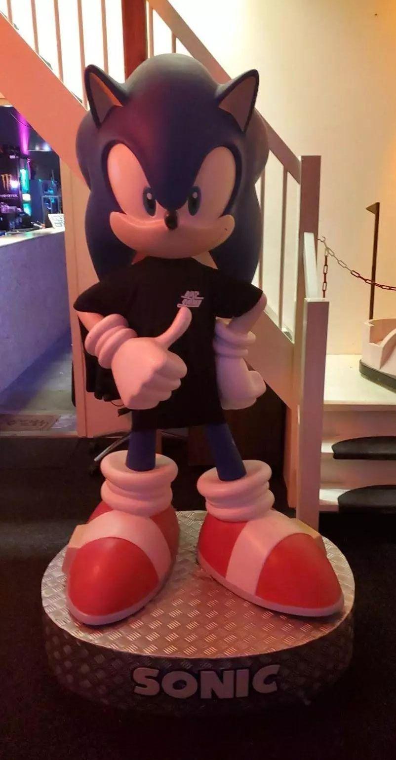 我進去的時候,一個比真人還大的刺猬索尼克雕像迎接了我。墻上和地板上散落著各種電子游戲配件和圖標。門廳里空無一人,變成了一個完全開放的倉庫區域,左邊是酒吧,中間是一排排野餐桌,右邊是沙發和桌子,還有一堆珍貴的街機游戲占據著一半的可用空間。從PacMan到Galaga,再到TimeCrisis3這樣的射擊游戲,這里有足夠填滿五個中型拱廊的街機游戲。