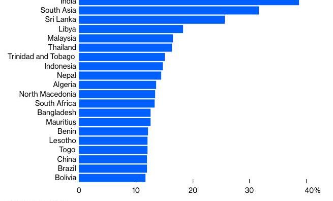 圖釋:過去一年中,15歲以上、未使用過金融機構賬戶的人口占比排行