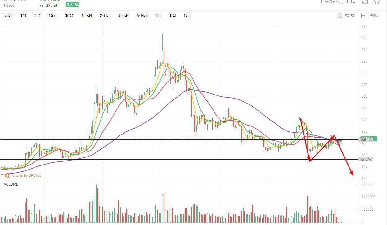 ETH還在5周線附近徘徊,現在是縮量站上了5周線,未必能夠站穩,周線級別的均線系統基本呈現一個空頭排列,BTC的走勢不穩定也制約了超底盤的涌入,跟之前的判斷基本吻合,目前的成交量不能繼續支撐該標的大幅度的反彈,目前該標的走獨立行情的可能性較低,大概率跟隨市場,個人認為針對9月24日陰線的反抽已經基本結束,接下來會繼續尋找底部支撐,而且我個人對于該標的看的比較空,我認為該標的可能會再創新低,建議大家多關注BTC和平臺幣的品種,一個有人氣,一個有潛在的業績支撐,當然僅僅是我個人看法,注意風險。