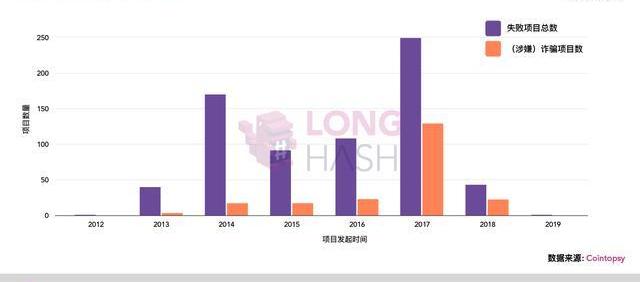另一批項目的失敗是因為詐騙——Coinopsy上高達29.9%的項目屬于這一類。這些涉嫌詐騙的項目大都出現在2017年,很有可能是牛市失控時帶來的。在這個數據集里,2017年騙子項目的數量是上一年的5倍以上。