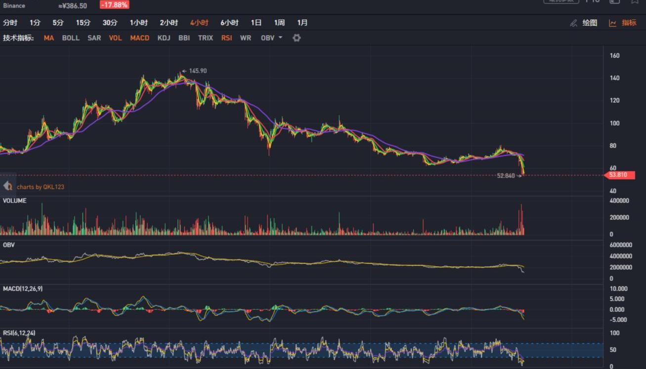 今日凌晨LTC放量下行最低觸及52.8美元,短時放出天量。與此同時,LTC/BTC交易對放量下行,最低觸及0.00640BTC,有明顯放量,空軍暫時被壓制。