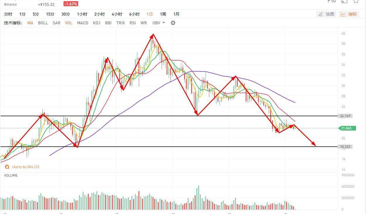 BNB已經連續橫盤多日,從前的走勢來看,該標的構筑了一個大型的頭肩頂,已經確認是一個中期調整的走勢,這里即使有反彈該標的也不會有什么太大的彈性,我個人認為該標的在靠近20天線后還將進一步下探尋求支撐,該標的可能會在18美元附近得到有效支撐,如果在18美元出現小幅放量的話,我會考慮小倉位抄底,不構成建議,注意風險。