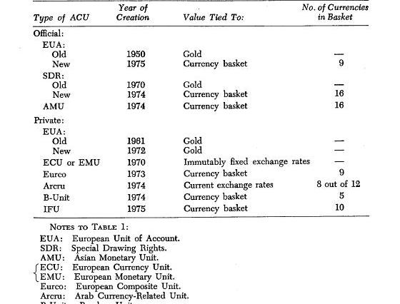 1974年,漢布羅斯銀行成立了阿拉伯貨幣相關單位。Arcru由十二種阿拉伯貨幣組成,旨在吸引擁有充裕的石油利潤的阿拉伯投資者。第二年,里昂信貸銀行創建了歐洲和非歐洲十種貨幣的組合單位,并把它稱之為“國際金融單位”。這是一個比Arcru和Eurco更為廣泛的記賬單位,IFU中組成貨幣的相對權重是基于每個國家在國際貿易中的份額來決定的。