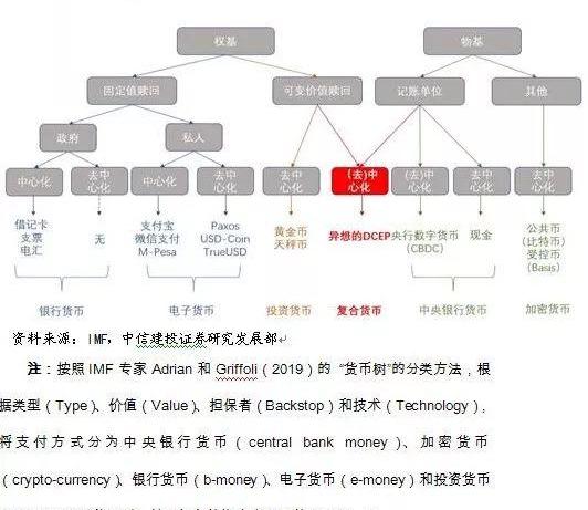 參照IMF專家關于數字貨幣的“貨幣樹”分類,以上類型的DCEP既是由央行創設的記賬單位,屬于物基支付方式;同時又具有錨定一籃子儲備資產特點,具有權基(claim-based)支付屬性,可以稱為兼具權基與物基屬性的復合幣種。
