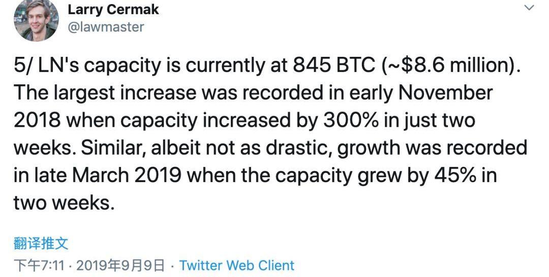 閃電網絡現在的容量是845btc。2018年11月容量在兩周內增長了300%,那是增長最快的時候。類似的,2019年3月下旬,容量在兩周內增長了45%,那是增長率最大的時候。