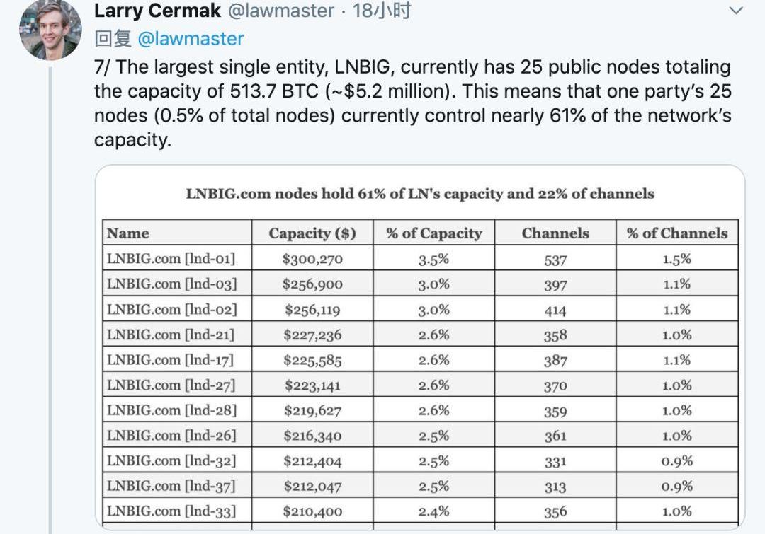 最大的單一實體-LNBIG,目前有25個公開節點,總容量為513.7BTC。這意味著一個擁有25個節點的實體目前控制了接近61%的網絡容量。