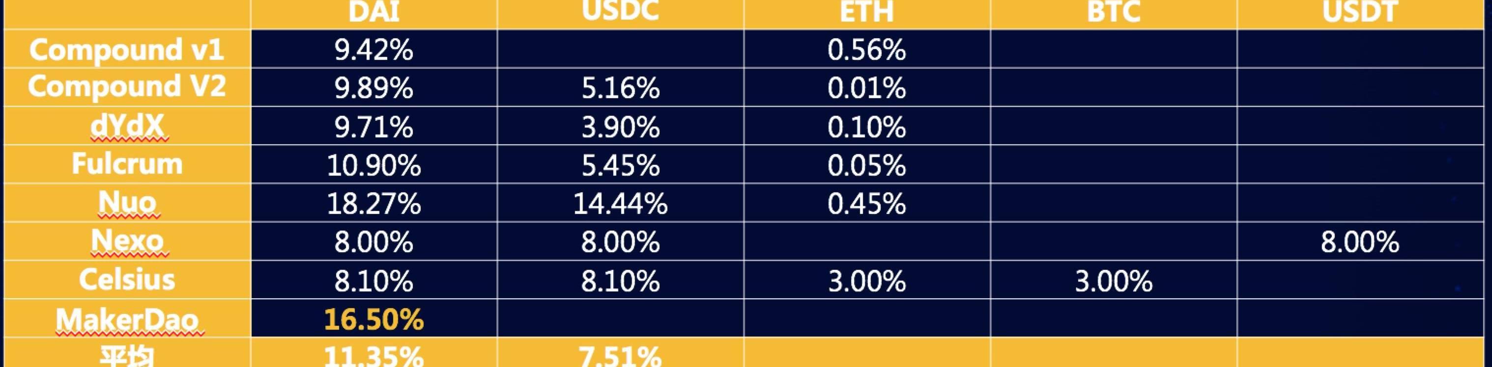 我們來對比一下去中心化借貸和去中心化借貸的年化利率。在去中心化借貸平臺上,用戶通常會借的穩定幣是Dai和USDC,Dai的平均年化利率是11.35%,USDC則是7.51%。
