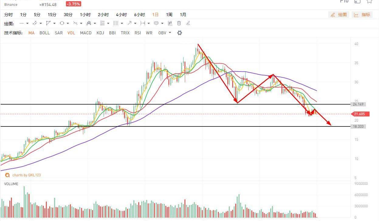 BNB再次跌破了5天線,成交量還是無明顯變化,呈現一個逐步萎縮的狀態,以目前的跡象來看,該標的目前的抄底盤并不多,資金比較謹慎,本輪的反彈不過是對前期低點24美元被跌破的一個反抽確認,目前來看反抽似乎已經結束,我個人認為該標的還將進一步下探尋求支撐,我們仍然維持中期調整判斷,按照量度跌幅測算,該標的可能會在18美元附近得到有效支撐,如果在18美元出現小幅放量的話,我會考慮小倉位抄底,不構成建議,注意風險。