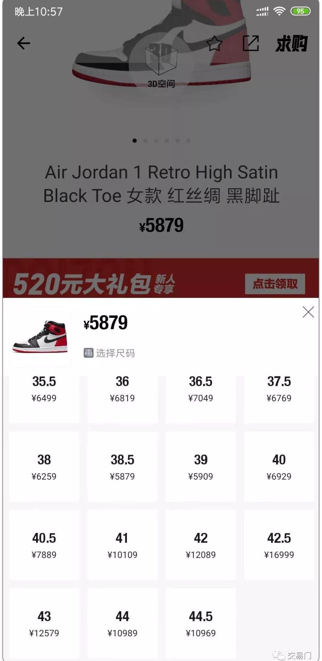 目前國內最大球鞋網上交易平臺是“”APP,我們在APP內找到了一雙群里這些熱心朋友講的剛發售幾天就讓他們賺了幾倍的一款鞋——AirJordan1RetroHighSatinBlackToe女款紅絲綢黑腳趾。