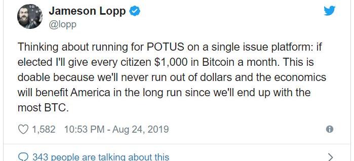 盡管他的推文獲得了1600個贊,但要想成為世界上權力最大的人,這個數字還遠遠不夠。每月給公民發放比特幣的提議很可能是可行的,不過前提是美元的供應是無限的,這似乎是當前的目標。