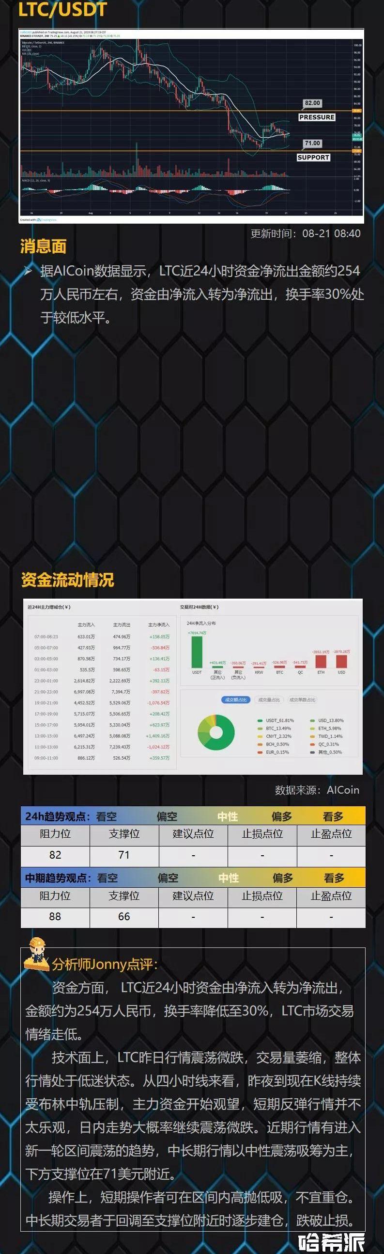 分析 | 大盤昨晚直線拉升后續怎么走?:金色財經分析師認為近期各主流幣在前日下破低點得到周線級別的重要支撐,昨日在平臺幣的帶動下開啟反彈大漲,日線反包形成,短期看漲,預計近日將逐步測試上方壓力位,若能突破大跌后的K線,則宣告調整結束,開啟新一輪趨勢行情,建議拿好手中中長線籌碼,短線可以適當低吸入場。BTC支撐3750/3700,壓力3890/3950;EOS支撐3.5/3.35,壓力3.85/4.35;ETH支撐133/129,壓力140/146;HT在1.62-1.42區間,其他品種同步BTC操作。