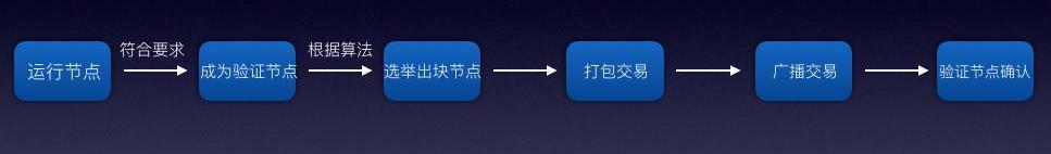 一般情況下,PoS共識下創造區塊有6個基本步驟:運行節點-成為驗證節點-選舉出塊節點-打包交易-廣播交易-驗證節點確認。PoS中,礦工除了負責出塊外,還要充當驗證節點的角色。成為出塊節點之前,持幣人需要運行節點客戶端,成為一個區塊鏈分布式網絡中的接入點,也叫節點。符合系統要求的節點可以成為驗證節點,系統將使用特定算法從驗證節點中選舉每個區塊的出塊節點。Stake便屬于達成驗證節點要求的一種手段。