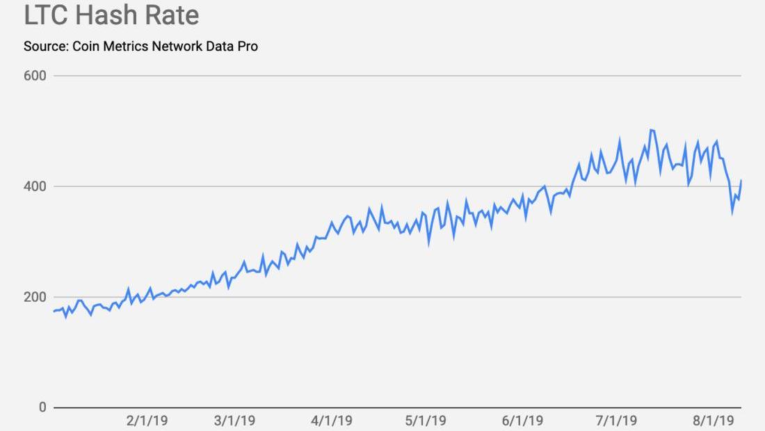 萊特幣的算力在8月5日的區塊獎勵減半后開始下降,在8月7日跌至358TH/s谷底,此后開始反彈,在8月10日回升至413TH/s。