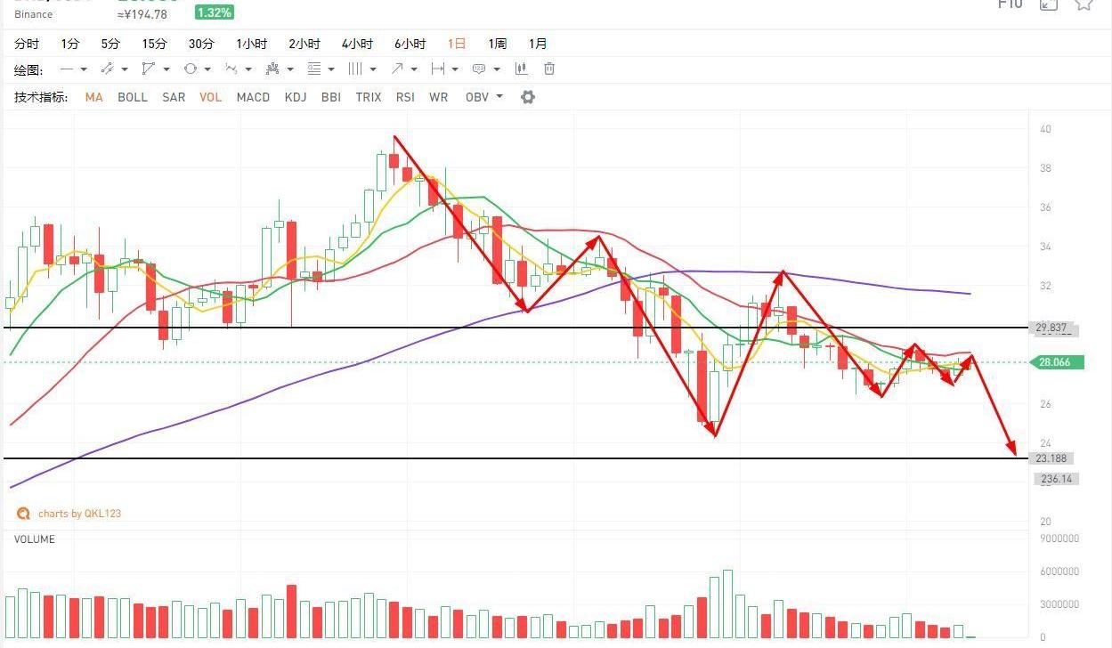 BNB又成功站回了5天線,維持昨天的觀點,短暫震蕩過后還是要向下,我們不否認該標的的長期價值,但是接下來一段時間的走勢我們是不看好的,最多也就是再度反抽60天線,還將繼續向下運行,均線系統保持空頭排列,macd指標在弱勢區域反復再次金叉之后粘合,無發散方向,該指標要到零軸之上才有較強的指向意義,該標的重新站回60天線并且使得60天線拐頭向上才能擺脫目前的下降趨勢,個人認為24美元的低點不能有效支撐,還會繼續下探,下一支撐位在21美元附近,注意風險。