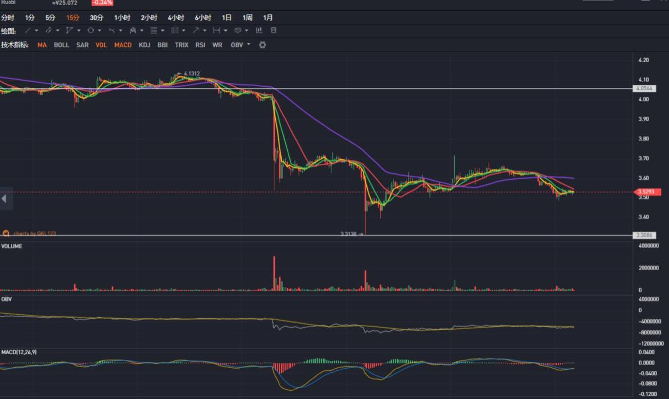 昨日EOS自3.3美元快速反彈,最高反彈至3.7美元,形成一條長長的上影線,之后震蕩下行,目前在3.5美元附近徘徊。EOS/BTC交易對自今日低點0.000345BTC快速反彈至0.00036BTC附近震蕩。