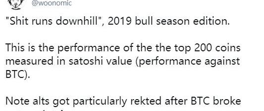 一張由分析師WillyWoo創建的圖表捕捉到比特幣在過去七個月中的絕對主導地位。該圖表跟蹤按BTC價格計算的山寨幣價格。大體趨勢顯示,山寨幣價格相對于比特幣暴跌。特別是在2019年4月,整個山寨幣市場在比特幣飆升的那一刻開始下滑。交易者似乎從山寨幣中取出錢,轉而分配給比特幣。