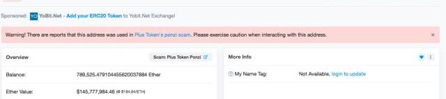 在以太坊區塊瀏覽器地址官網,此前據傳的PlusToken以太坊地址顯示,該地址因被用于PlusToken旁氏騙局遭舉報。目前該地址有78萬枚以太坊,價值1.45億美元。PlusToken被曝光時,該錢包78萬枚以太坊價值2.3億美元。