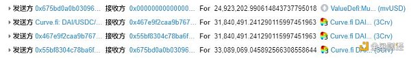 再 次 , 攻 擊 者 將 2500 萬 DAI 充 值 進 ValueMultiVaultBank 合約,如圖 2-1-15,計算鑄幣 時會將 DAI 轉換為 3CRV,此處鑄了 2495.6 萬的 3CRV,并 且攻擊者獲得與之等價的 mvUSD。
