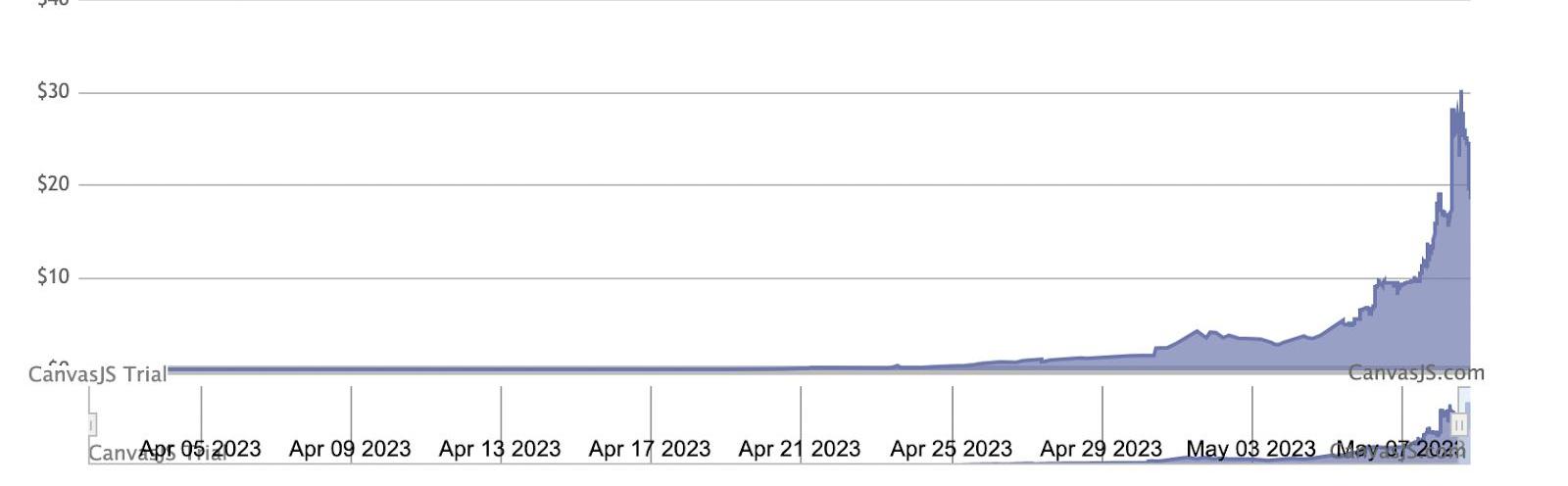 BRC-20的總市值在過去幾周飆升,從4月25日的1750萬美元激增3441%至5月9日的6.197億美元。許多BRC-20類代幣都經歷了類似的拋物線式上漲。