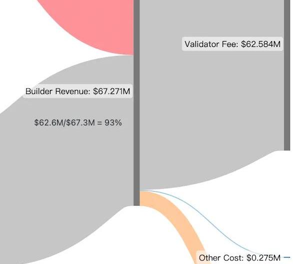 然而,盡管構建者的收入達到了令人矚目的6730萬美元,但93%被分配給接力拍賣中的出價,以補償驗證者,確保驗證者最終會提議區塊。因此,這兩個月的構建者的實際收入僅為440萬美元。驗證者在2023年的前兩個月收到了6260萬美元。
