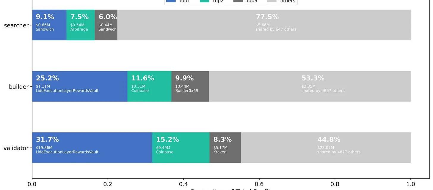 總的來說,桑基圖描繪的MEV市場為構建者和驗證者提供了一個豐富的多層次收入的蛋糕。這些利潤的大部分被Lido這樣的市場領導者撈取,他們已經成功地切下了最大的一片。雖然MEV的“蛋糕”很大,但值得注意的是,這個蛋糕的分配并不均勻,大部分都流向了接力拍賣。