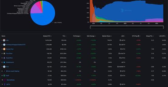 根據Defiliama的數據可以看出,目前排名第一的Lido的市場份額達到74.61%,排名第二的為中心化交易所Coinbase,排名第三的為RocketPool。