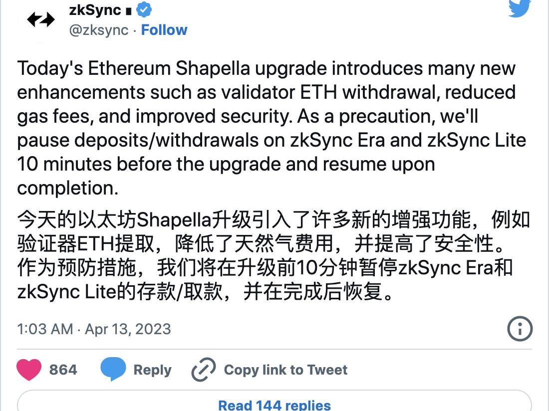 下午1時24分:ZkSync時代,以太坊上的零知識匯總,幾周前上線,引起了很大的轟動,發布了一個更新的運營計劃,當天晚些時候,當上海上線。可能很多球隊都在做這樣的事情。