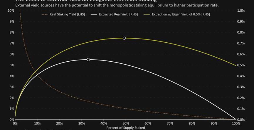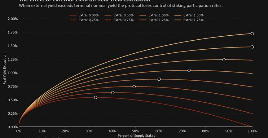 當我們對不同的外部再質押的演變平衡進行建模時,結果是驚人的。由于外部收益率不是自我稀釋的,即使是少量增加的收益率也可能對質押生態產生巨大的影響。如果像EigenLayer這樣的協議能夠產生足夠的外部收益率供應,而收益率僅為1%,那么最佳的質押動態可能被推到無法維持的水平。
