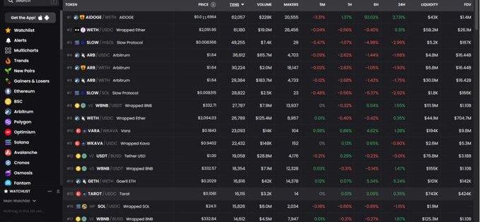 @dexscreenerDexscreener是一個DEX的實時數據跟蹤工具,用戶可以查找新貨幣對、跟蹤大額交易、設置警報等網址:https://dexscreener.com