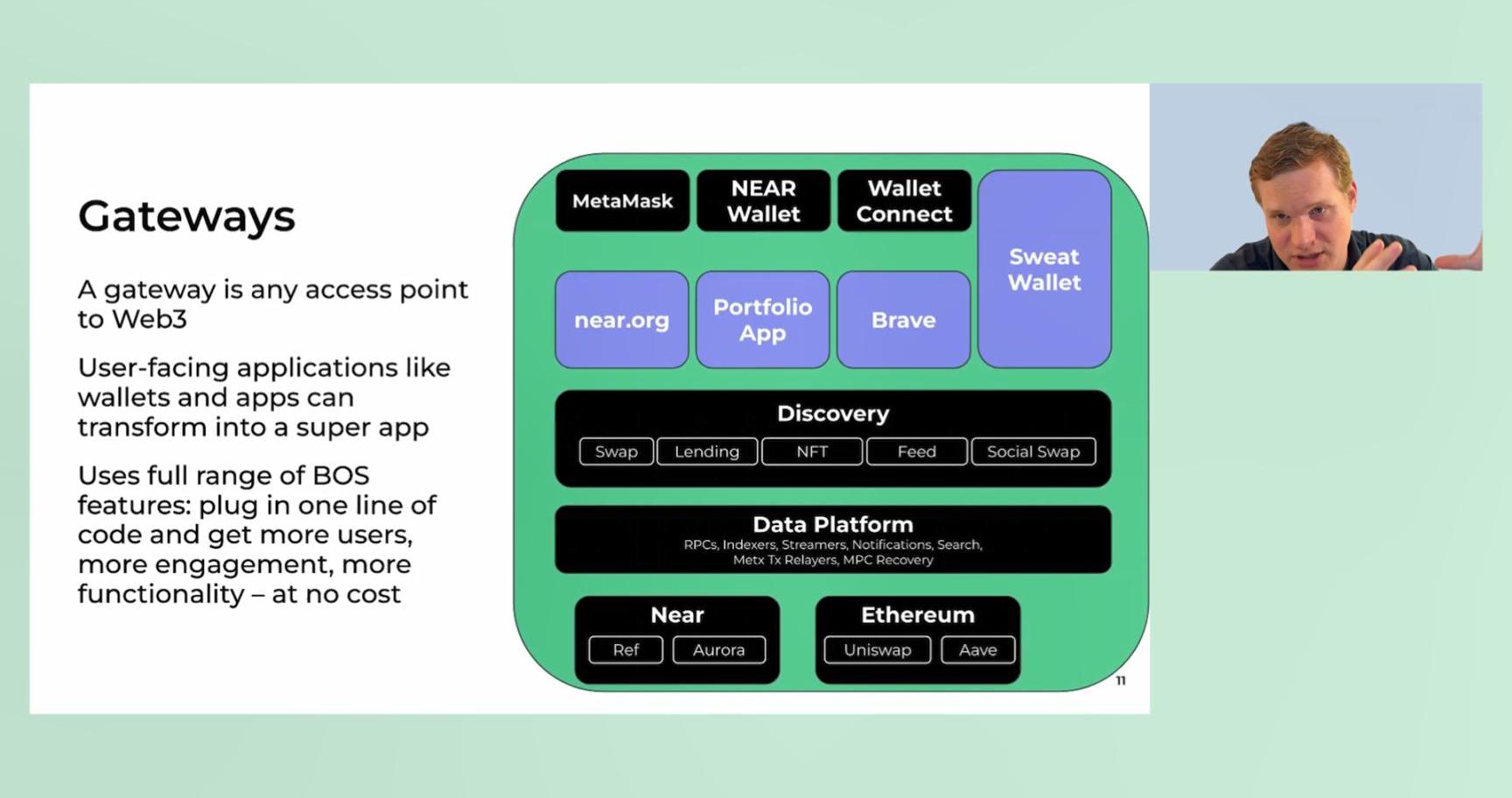 最后是門戶。門戶是訪問區塊鏈操作系統的方式,它是一個開放的生態系統,任何人都可以運行這個接入點。作為一個門戶,你可以挑選你想要使用的堆棧的部分。你可能不會使用操作系統的所有功能,但這可以轉變你的應用程序,你的瀏覽器、你的錢包快速變成一個超級應用。你不需要構建那些即時應用和所有的生態系統,因為它在所有這些門戶之間共享。