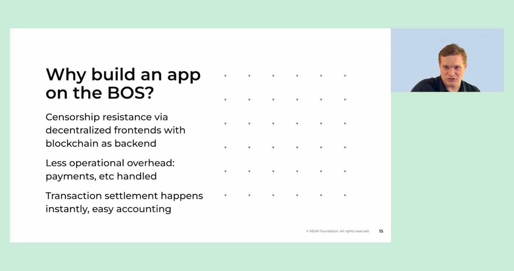為什么你要在BOS開發應用呢?你得到了一個抗審查的、去中心化的前端,你什么都不需要做,比如不需要設置hosting并支付費用,你不需要為此擔心。只要啟動它,所有用戶都可以通過任何門戶訪問它。你的運營開銷和開發周期比以往少很多,所有這些身份支付,一切都為你處理好了,你可以建立一個非常簡單的核算系統。