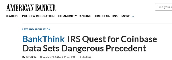 2016年11月,它要求美國比特幣交易所“Coinbase”,交出2013-2015年購買比特幣的用戶記錄。
