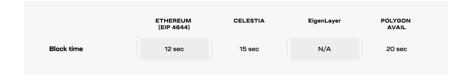 在這三個項目中,兩個項目的區塊時間都在8秒之內:以太坊的區塊時間為12秒,Celestia為15秒,Avail為20秒。它們之間的差異真的不大,也沒有明顯的影響。如果看一下它們需要多長時間才能達到最終結果,它們之間的真正區別就變得更加明顯了。
