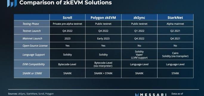 將于3月27日開啟主網測試版的PolygonzkEVM;已向Buider推出主網的zkSyncEra;剛剛發布GoerlizkEVM測試網的Scroll;處于Type3狀態并且正在升級的Starknet的KakarotzkEVM;