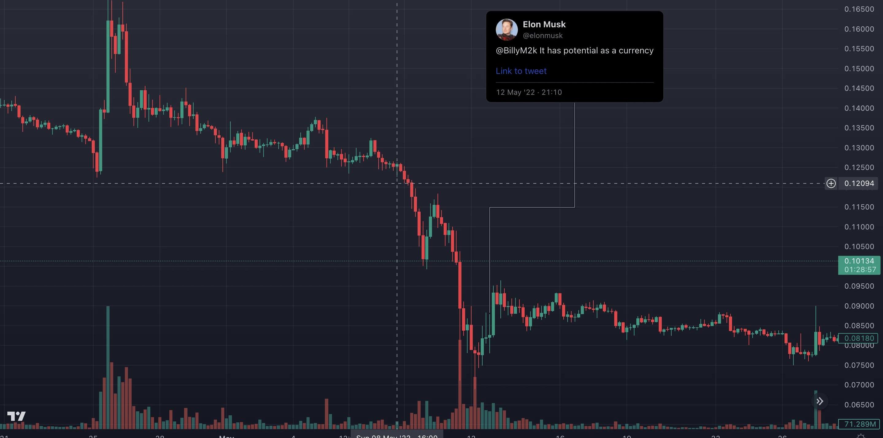 在此之前,DOGE?正在持續下跌。剛剛止跌不久,馬斯克即發表了這條推特。DOGE?在兩條?K?線內快速拉升超過?20%?,最終在第?4?條?K?線達到本次上漲頂點,漲幅約?24%?。