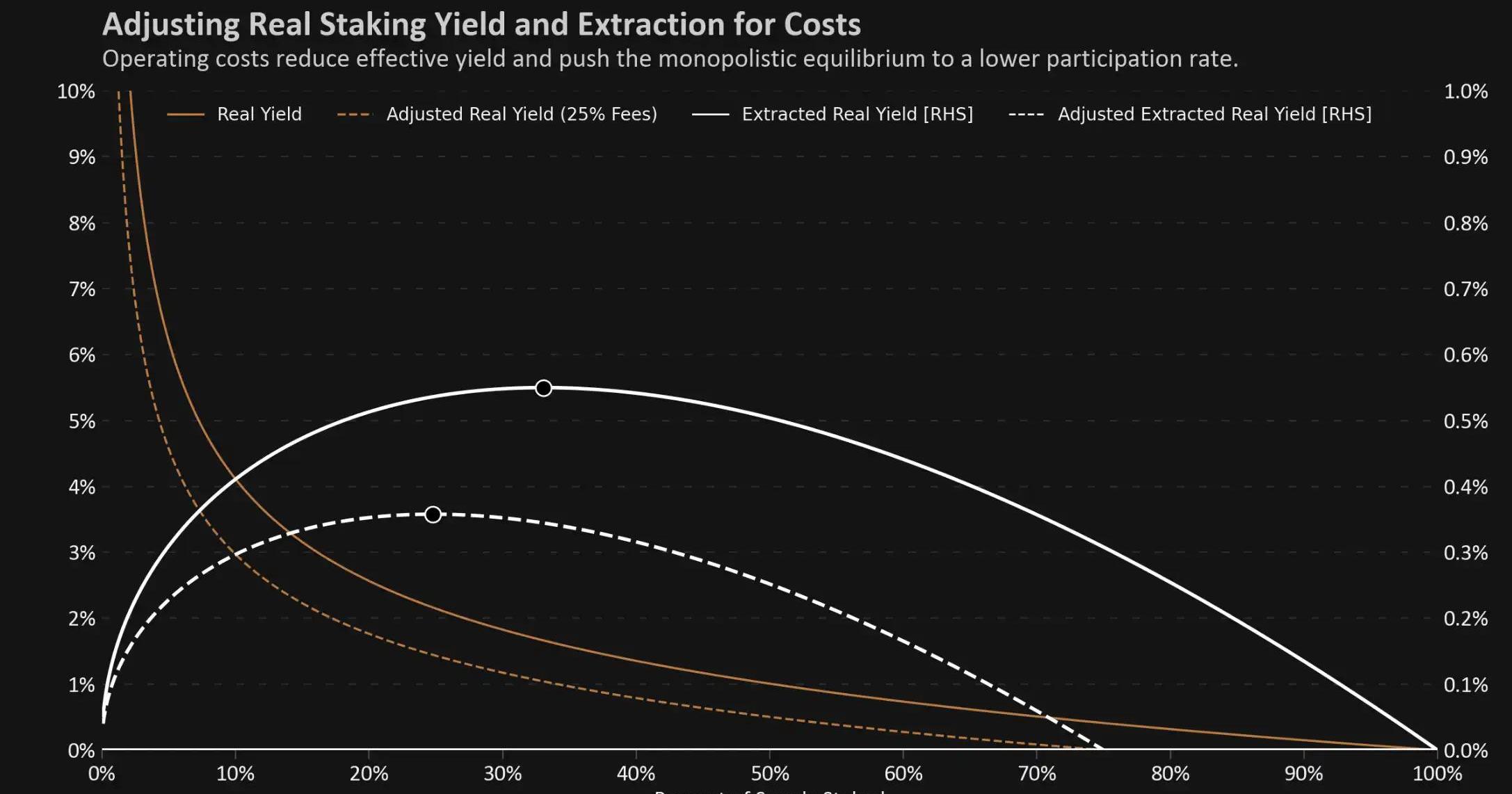 我發現將各種質押者想象成單一或小群體的壟斷者,并計算他們能夠從非質押者中提取的最優實際收益和他們將鎖定的供應份額,是分析這個反饋循環的一種有用方法。
