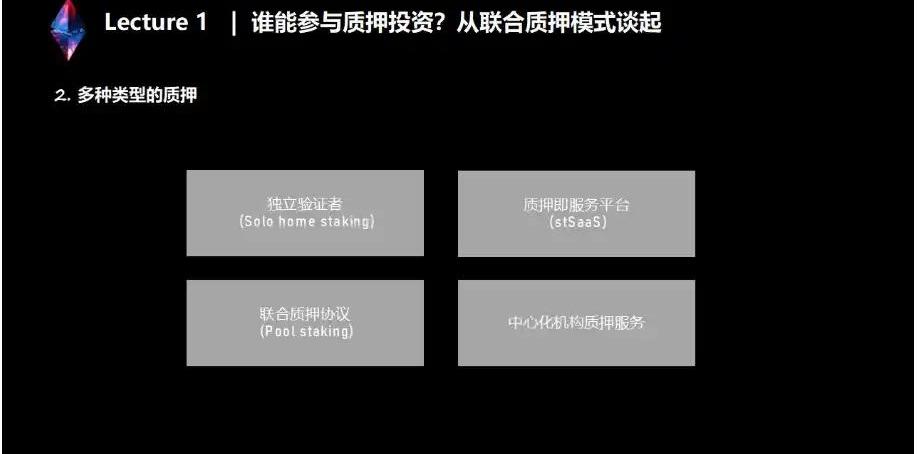 第一個類型是獨立驗證者;第二個類型是質押即服務平臺;第三個類型是聯合質押機制;第四個類型是中心化機構的質押服務。