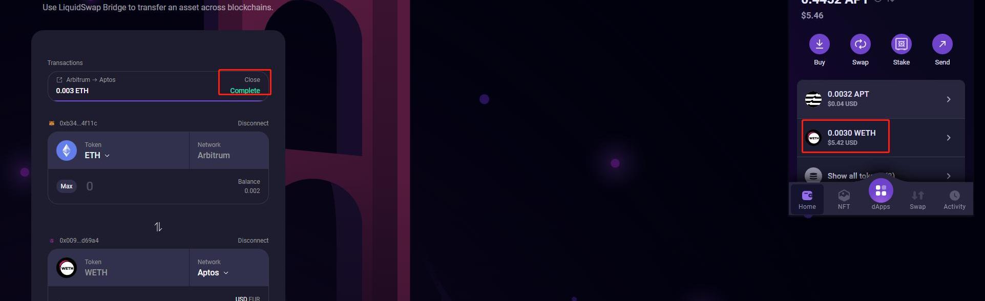 由于接下來2個都是arb-aptos。ETH跨鏈轉回需要2-3天之后才可以,所以少跨一點E刀aptos鏈。這里跨個0.003E過去大概5刀。