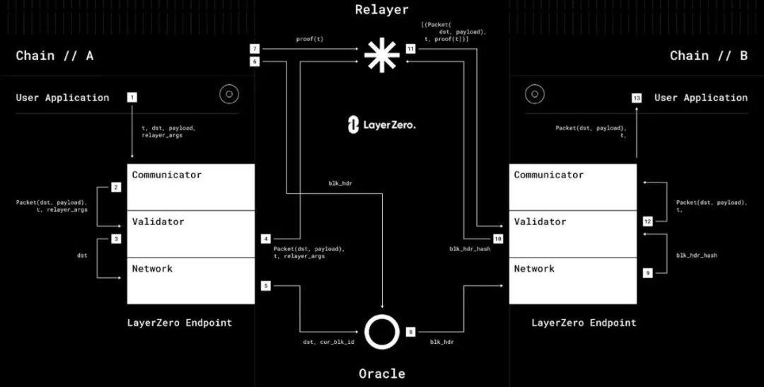 步驟8:Oracle等待一定數量的區塊確認,然后確認該塊已在ChainA上成功提交。確認后,預言機將塊頭發送到ChainB上的網絡。步驟9:網絡將區塊哈希發送到驗證器。步驟10:驗證器將區塊哈希轉發給中繼器。步驟11:中繼器發送與當前區塊匹配的所有數據結構列表。步驟12:驗證器通過查看網絡存儲的交易證明和塊頭來確保交易有效且已提交。如果塊頭和交易證明匹配,則以打包形式將交易信息發送到通信器。步驟13:通信器將信息發送到ChainB上的用戶應用程序中。概括第8-13步就是——LayerZero在ChainB上的端點使用塊頭獲取由ChainA上的用戶應用程序發起的信息,并將其發送到ChainB上的用戶應用程序。