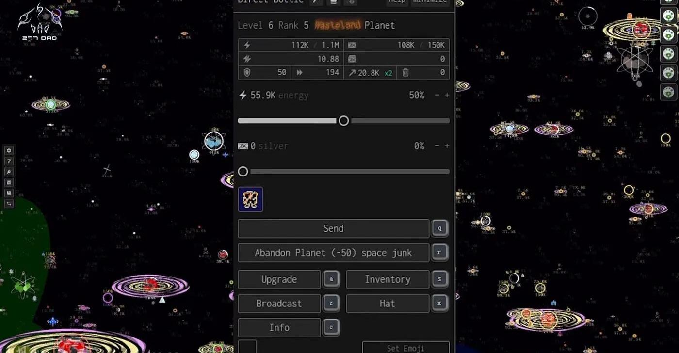 游戲中玩家攻擊其他玩家的星球的方式為發送能量,到達能量將與被攻擊星球的防守能量相減,若大于防守能量則可攻占該星球。星球會按時間流逝生產能量或銀礦,同時可以儲存飛船和神器。星球可以通過“broadcast”廣播功能向宇宙發送廣播,這將使得該星球的信息對所有玩家可見。